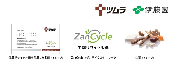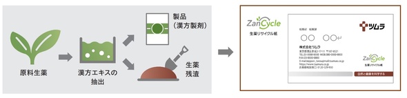 生薬リサイクル紙は、2025年4月からツムラの従業員名刺に採用され、同年9月には封筒の制作も始まる。封筒は異なる色や材質の3種類を開発中で、最適な候補を選定している。今後は生薬リサイクル紙の製品をはじめとするアップサイクル製品に「ZanCycle(残サイクル)」マークを使用し、さまざまな取り組みに活用するとしている。