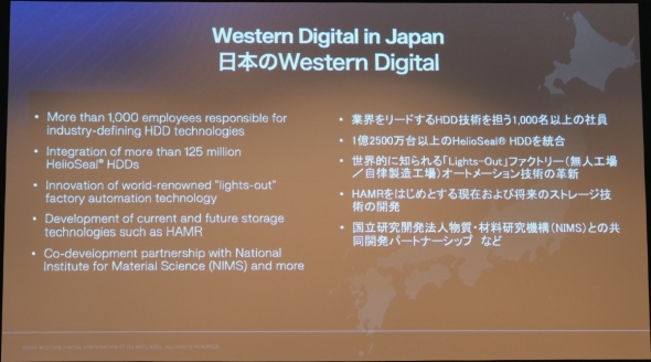 ジャパンカントリーオフィサーの高野氏は「日本はスピントロニクスや磁性材料、金属材料の先端研究が進んでおり、ウエスタンデジタルはNIMS(物質・材料研究機構)をはじめとするアカデミアの協力を得て開発を進めている。HDDの磁気記録技術だけでなく、生産自動化のためのロボティクス技術にも強みがある」と述べる。