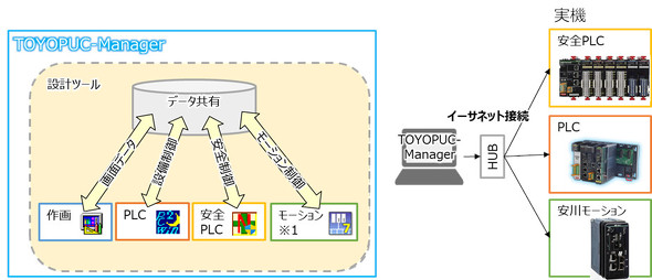 TOYOPUC-Managerは、工作機械や設備において、従来は別々に設計していたPLC(プログラマブルロジックコントローラー)、安全PLC、操作画面、モーションコントローラー(安川電機製ツールのインストールが必要)をシームレスに設計/保守することが可能なツールとなる。