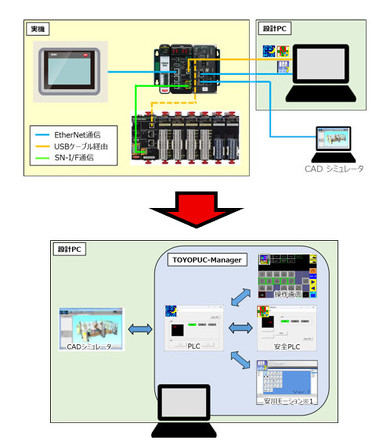 また、PC上でTOYOPUCの安全PLCを含めた設備全体のシミュレーションが可能になる。実機とそれに対応する設計ツールを用意して行うデバッグ作業に比べて、シミュレーションによるデバッグ作業は実機を用意する手間などを削減できる他、各制御機器を連携させたシミュレーションにより設計工数を短縮する。