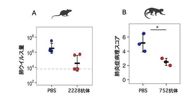 また、ヒトTMPRSS2を導入したマウスに予防的投与すると、肺内のウイルス量が抗体投与のないマウスの10分の1に低下した。カニクイザルに治療目的で投与した場合も、体温上昇や肺の炎症病理スコアが抑制され、ウイルス量は20分の1に低減した。