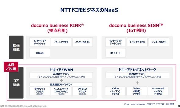 そこでNTTドコモビジネスは、クラウド型ネットワークでのNaaS型サービス「docomo business RINK」と「docomo business SIGN」に、新たにセキュリティ機能を搭載して提供する(docomo business RINKは提供開始済み、docomo business SIGNは2025年12月提供開始予定)。
