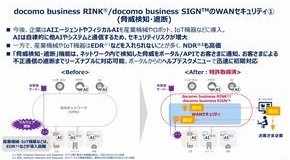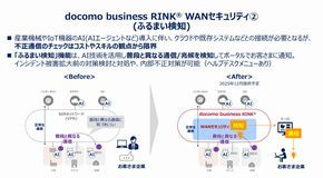 また、docomo business RINKには「ふるまい検知」「フローコレクター」機能も搭載される。ふるまい検知は、例えばAI搭載の産業機械やIoT機器が通常とは異なる通信や兆候を示した際に、AI技術を用いて検知し、ポータル経由で顧客へ通知する機能である。これにより、インシデント被害の拡大を抑止し、内部不正対策や初期対応を支援する。