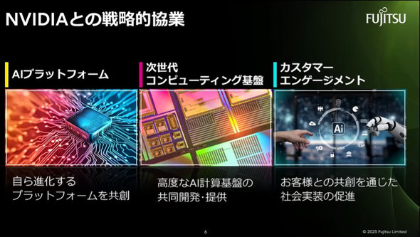 富士通とNVIDIAは2025年10月3日、AIエージェントを統合したフルスタックAIインフラストラクチャの構築を目指し、戦略的協業を拡大することを発表した。フィジカルAI領域や量子コンピューティング領域を重点領域とし、共同でAIコンピューティング基盤の開発や、ユースケースの創出などに取り組む。