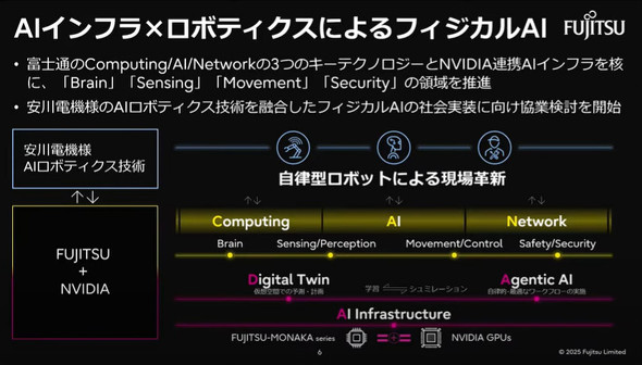 フルスタックAIインフラにおけるターゲット領域とする1つが「フィジカルAI」だ。富士通のコンピューティング、AI、ネットワーク技術に、NVIDIAのAI関連技術を活用し、自律型ロボットによるさまざまな現場環境の改善に取り組んでいく。既に、安川電機との共創が進んでおり、富士通とNVIDIAによるAIインフラを活用し、安川電機のAIロボットで何を生み出していけるのかについて、検討を進めているという。