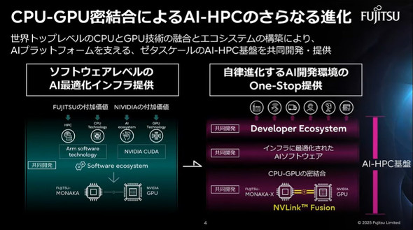「次世代コンピューティング基盤」は、富士通の持つArmベースのCPU技術と、NVIDIAの持つGPU技術を組み合わせ、CPUとGPUを密結合したAI-HPC(ハイパフォーマンスコンピューティング)基盤を共同開発する。富士通のCPU「MONAKA」とNVIDIAのGPUの連携について共同開発するとともに、NVIDIAの「NVLink Fusion」の活用なども進めていく。