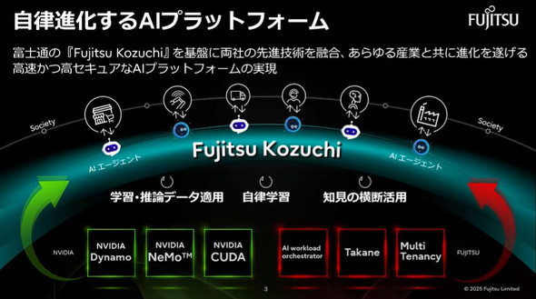 「AIプラットフォーム」は、富士通のAIサービス「Kozuchi」を基盤とし、NVIDIAの持つ「Dynamo」「NeMo」「CUDA」などを組み合わせることで高速で安全なAIエージェントプラットフォームの構築を目指す。