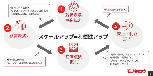 モノタロウでは通信販売サービスを展開するのに、まず約20万点の商品データベースを構築して商品情報を公開した。それら商品を必要とするユーザーは会員登録をし、これらの商品を購入する。取扱製品の品ぞろえが増えるにつれ、利用者が拡大し、会員数も増加している。
