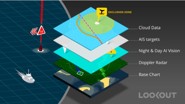 LOOKOUTの中核は、画像認識(可視光/赤外)、AIS、レーダーARPA(自動衝突予防援助装置)、ソナー、各種航海情報入力を統合データストリームへ束ねる「Data Fusion 360」だ。検出(Detection)と追跡(Tracking)をリアルタイムに実行し、フレーム間でインスタンスIDを維持して“見失い”に強いトラッキングを実現した。小さな対象でも15〜20ピクセル規模で認識し、30cm級の浮遊物や数百m先にある3m級小型船まで捕捉できるという。