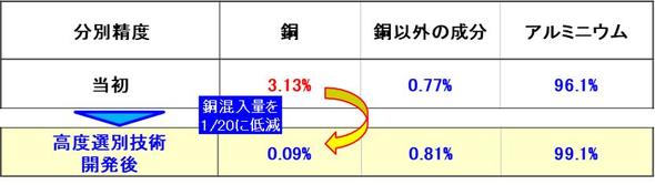 リサイクルサイトを運営する日本磁力選鉱は、熱交換器に使用するアルミと銅の高度選別技術を開発。当初3%程度あった不純物の銅成分を、0.1%以下にまで低減することに成功した。