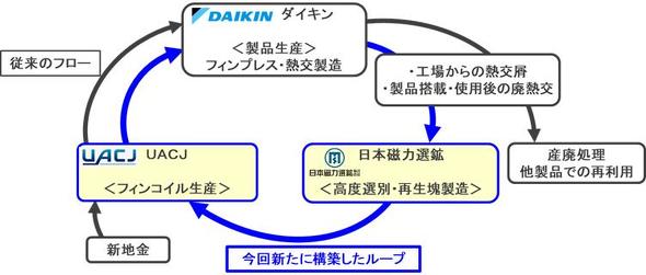 日本磁力選鉱とダイキン工業、UACJは、空調機の熱交換器に使用するアルミフィンの水平リサイクル技術の実証実験を行い成功した。熱交換器用アルミフィンのライフサイクル全体における、二酸化炭素排出量の大幅な削減に貢献する。