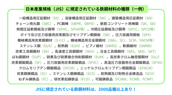 現在、日本産業規格(JIS)には、約200もの数の鉄鋼材料の材質に関する規格が制定されています。そこから化学成分または強度ごとに品種が細分化されており、総じて2000を超える品種の鉄鋼材料が規定されています[参考文献1]。