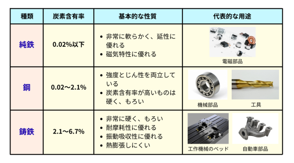 次のページからは、鉄鋼材料として利用頻度が高い「鋼」と「鋳鉄」の種類を説明します。