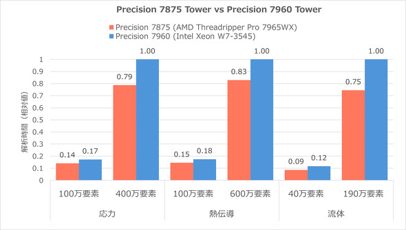 図3 「Dell Precision 7875 Tower」(CPU:AMD Ryzen Threadripper Pro 7965WX)と「Dell Precision 7960 Tower」(CPU:Intel Xeon W7-3545)の検証結果[クリックで拡大] 提供:ムラタソフトウェア「今回のベンチマークテストでは、全体的にRyzen Threadripper ProがIntel Xeonを約20%上回りました。特に要素数が増えるほど、また応力解析や流体解析といった計算負荷の大きい分野で、解析時間の短縮効果が顕著に表れました」(伊勢氏)