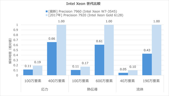 次に、新旧Xeonの比較結果だ(図4)。新モデルのDell Precision 7960 Towerと、「Intel Xeon Gold 6128」(24コア/48スレッド、ベースクロック:3.40GHz)を搭載した旧モデル「Dell Precision 7920 Tower」を比較した結果、当然ながら最新世代Xeonが圧倒的な性能を発揮した。特に流体解析では、CPU2基構成の旧モデルに対して、CPU1基構成の新モデルが計算時間を半分以下に短縮している。