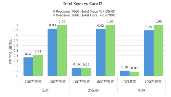 図4 「Dell Precision 7960 Tower」(CPU:Intel Xeon W7-3545)と「Dell Precision 7920 Tower」(CPU:Intel Xeon Gold 6128×2基)の検証結果[クリックで拡大] 提供:ムラタソフトウェア一方で、意外な結果が得られたのが、Xeon搭載の新モデルであるDell Precision 7960 Tower(メモリ:512GB)と、「Intel Core i7-14700K」(20コア/28スレッド、ベースクロック:3.40GHz)を搭載する新モデル「Dell Precision 3680 Tower」(メモリ:64GB)の比較である(図5)。