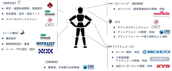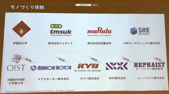 設立時点で名を連ねた早稲田大学、テムザック、村田製作所、SREホールディングスに加え、そこから約3カ月の間に加わった沖縄科学技術大学院大学(OIST)、ソニーグループ/ソニーコンピュータサイエンス研究所、マブチモーター、カヤバ、NOK、ヒーハイストといった新たな参画企業を紹介。精密機構、モーター、油圧、シール、直動機器といった分野を担う国内有力企業が合流したことで、KyoHAは「総力戦」と呼ぶにふさわしい産学連携体制を形成しつつあるという。