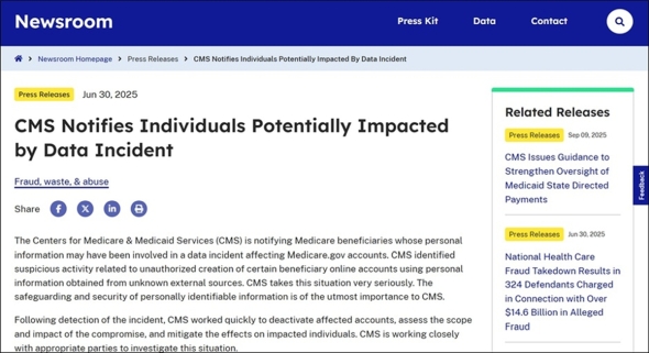 2025年6月30日、米国保健福祉省(HHS)および傘下のメディケア・メディケイド・サービスセンター(CMS)は、Medicare.govアカウントに関するデータインシデントにより、個人情報が影響を受けた可能性のあるメディケア受給者に対して通知を行っていることを公表した(図1参照、関連情報)。