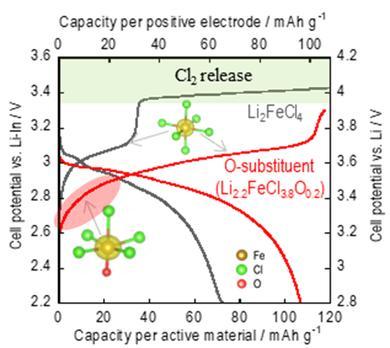 その上で、鉄塩化物(Li2FeCl4)の一部を酸素で置換する「アニオン置換」を行い、酸化還元反応に関わるエネルギー準位(レドックス準位)を意図的に調整した。その結果、この新材料(Li2-2FeCl3-8O0-2)は、過充電時の性能劣化要因となる塩素脱離を抑制しながら、従来よりも大きなエネルギー密度(330Wh/kg-cathode)を達成した。