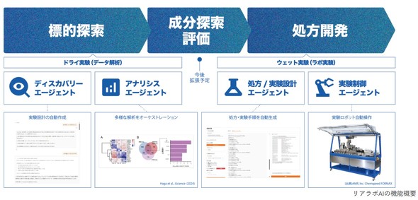 リアラボAIでは、論文などの情報収集やデータ解析など「ドライ実験」と、処方/実験手順の生成や実験ロボットの制御などの「ウェット実験」の2段階に分かれており、それぞれ2つのAIエージェントが連携して動作する。
