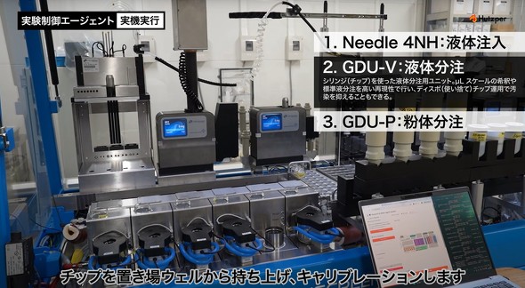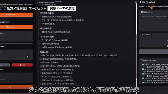 ウェット実験では、処方設計エージェントが成分リストや製造工程を提案し、実験制御エージェントがエーエムアールの自動化ロボット「CHEMSPEED FORMAX」の運転手順や試薬配置を設計する。実験手順が確定すると、シミュレーションを通じて実行結果や動作レポートが画面上に表示される。その後、設定した手順に基づき、実機ロボットが液体の注入や分注などを行う。