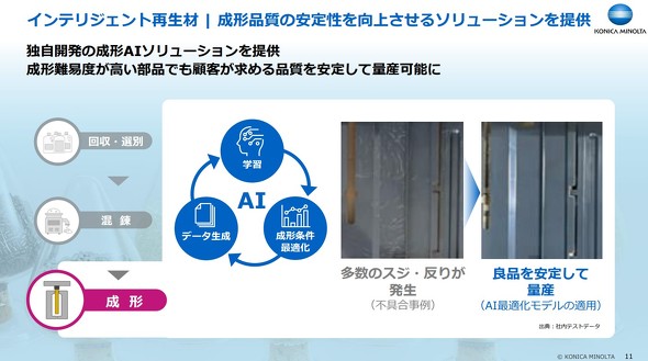さらにコニカミノルタは、成形工程のためのAI最適化モデルも新たに開発した。再生材は部品製造時に不良品が発生しやすいという課題があったが、この最適化モデルが部品ごとに最適な成形条件を提案することで、良品を安定して量産できるという。
