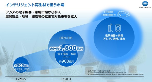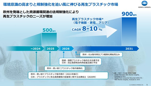 コニカミノルタがこのタイミングで事業化に踏み切る背景には、再生プラスチック市場の高まりがあるという。環境意識の高まりと法規制強化を受け、再生プラスチック市場は年率8〜10%の成長が見込まれており、特に同社が強みを持つ電子機器/家電分野での需要拡大を大きな事業機会と捉えている。