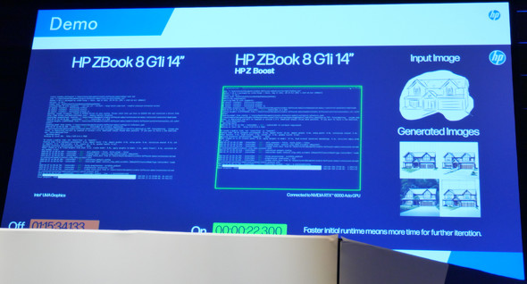 講演では、統合グラフィックス搭載の「HP ZBook 8 G1i 14inch」で画像生成AIモデル「Stable Diffusion」を実行したデモを披露した。HP Z Boostを使わない場合は1時間15分かかった処理が、利用時にはわずか22秒で完了したという。