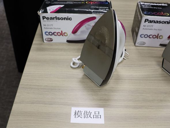 上の写真は、「Pearlsonic」というパナソニックと似たようなロゴを持った、家庭用アイロンの模倣品である。外箱はロゴが微妙に異なるだけで、遠目で見ると正規品だと勘違いしてしまう。製品についても、本体に刻まれたロゴが違うだけで、外観はほとんど変わらないように見える。