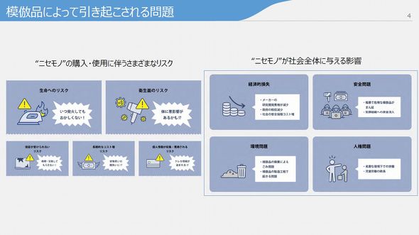 模倣品を放置しておくとさまざまなリスクが発生するが、一番危険なのは安全性や生命のリスクが発生してしまうことだ。正規品は衛生的な工場で適切な原材料を使い製造しているが、模倣品についてはどんな材料が使われ、どこで作られているのかが全く分からないため、人体に影響を及ぼす問題が起こりかねない。また、実際に摘発した模倣品はそのまま使用ができないので、全てをごみとして廃棄をしなければならず、社会面/環境面にも影響を与えている。