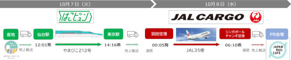 輸送列車と輸送航空便は、それぞれ「やまびこ212号」(仙台駅10月7日12:01発、東京駅14:16着)、「JAL35便」(羽田空港10月8日00:05発、シンガポールチャンギ国際空港06:10着)で、輸送品はJR東日本グループの仙台ターミナルビルが運営する「JRフルーツパーク仙台あらはま」で収穫した梨(約300玉)となる。