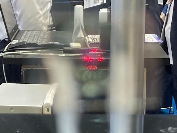 展示ブースでは、コンタクトレンズの前に透明のフィルムを密着させて、実際にどのように映像が見えるのかを確認できる「技術デモ品」を展示している。中をのぞいて見ると、実風景に重なる形で赤い文字を見ることができる。