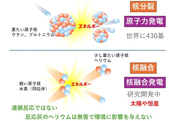 一方、核融合は、核融合発電に利用されようとしているがまだ実用化に至っておらず、現在研究開発中である。太陽など恒星が輝いているのは核融合によるものである。軽い原子核である水素(またはその同位体)が2つ融合して少し重たいヘリウムなどに変わる時にエネルギーが発生する。連鎖反応ではなく、原理的に暴走せず、さらに反応灰のヘリウムは無害で環境に影響を与えないという特長がある。