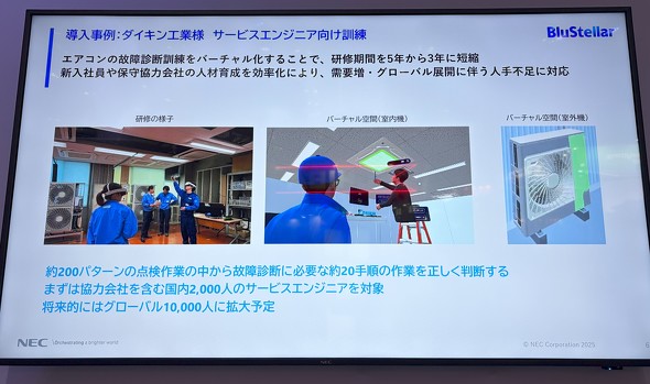 ダイキン工業は空調機の点検/診断研修にNECのバーチャルトレーニングセンターを採用し、2024年10月から運用を開始した。同研修をバーチャル化することで、研修期間は5年から3年に短縮できる見込み。当面はダイキン工業の協力会社を含む国内のサービスエンジニア約2000人を対象とし、将来的には同社のグローバル人材を含めて1万人規模に拡大する計画だという。