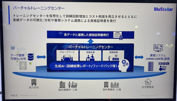 NECは「CEATEC 2025」(2025年10月14〜17日、幕張メッセ)において、VR(仮想現実)空間に研修/トレーニング環境を構築し遠隔での作業体験を可能にする「バーチャルトレーニングセンター」を展示した。