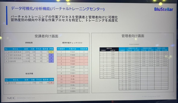 トレーニング後は受講者ごとの結果を可視化し分析することで、習熟度別の傾向や不要な作業プロセスを明確化できる。さらに、研修で取得した技能資格を分散型デジタル(VC)資格証明書として発行する機能や、生成AIによる訓練結果のレポート出力などの機能実装を進めているという。