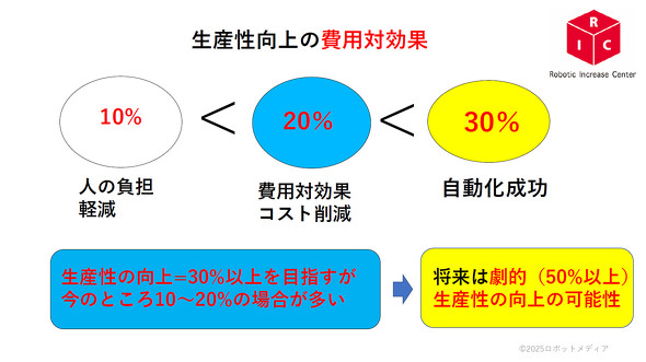 10%では人の負担軽減にとどまり、20%で費用対効果やコスト削減が見込まれ、30%あれば自動化やロボット導入は成功したと判断していいと思う。生産性が30%向上した、人員を3割削減できたとなれば、経営者も費用に見合った効果/効能があったと思うだろう。