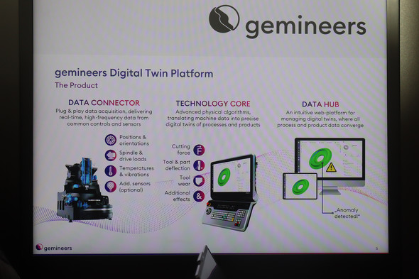 ドイツのgemineersでは、デジタルツイン技術による加工プロセスのモニタリングが可能になるソフトウェアを提供している。2021年設立のgemineersは、欧州有数の応用研究機関であるフラウンホーファー研究機構発のスタートアップ企業だ。社名は、ラテン語で双子を意味するgeminiとengineer(エンジニア)を組み合わせた造語となっている。