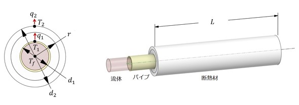 流体の温度が与えられているとき、熱の逃げる量を目標値以下に抑えるためには、断熱材の厚さをいくらにすべきかが問題となります。また、断熱材の表面温度を目標値以下にするには、やはり断熱材の厚さが重要な要素になります。