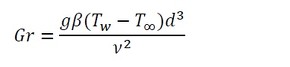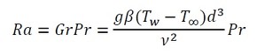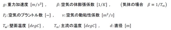 熱伝達率を求める必要があります。ダクトの場合、外部流れの自然対流熱伝達となるため、前回紹介した式が使用できます。グラスホフ数Grとレーレー(またはレイリー)数Raは、次の式で計算します(参考文献[1])。