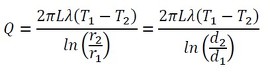 断熱材内側の直径をd1、温度をT1、熱流束をq1、断熱材外側の直径をd2、温度をT2、熱流束をq2とします。また、パイプ内の流体温度をTf、主流の温度(室温)をT∞とします。