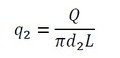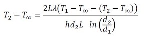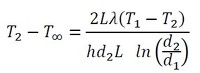 では、計算式を導いていきましょう。ダクトの場合、与えられているのは主流の温度とパイプ内の流体の温度です。ここでは、主流の温度側から攻めていきましょう。主流の温度と断熱材外側の温度との差は、式1で表されます。