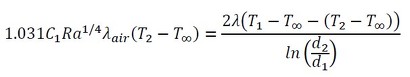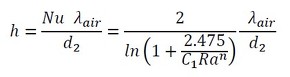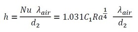 水平に置かれた円柱の熱伝達率は実験式があり、次の式で表されます(参考文献[1])。