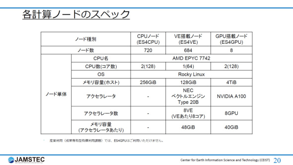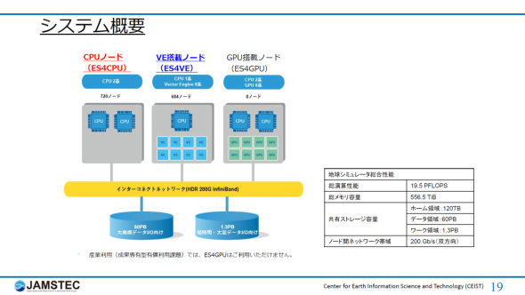 図5 第4世代のES4の概略構成図。ベクトルプロセッサを搭載したVE搭載ノードに加えて、x86アーキテクチャのCPUノード、学習や推論に適するGPU搭載ノードで構成されている[クリックで拡大] 出所:海洋研究開発機構それぞれのノードの概略は次の通りである。