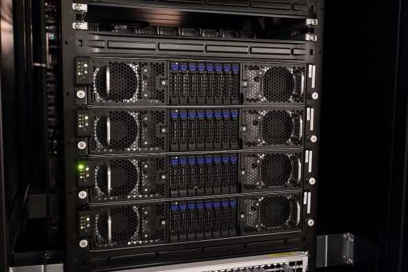 図7 ES4VE(VE搭載ノード)を構成する「NEC SX-Aurora TSUBASA B401-8」(写真に写っているのは648台中の4台)。各ノードあたりベクトルプロセッサ8基を内蔵している[クリックで拡大] 撮影:関行宏