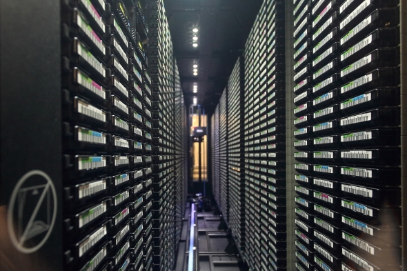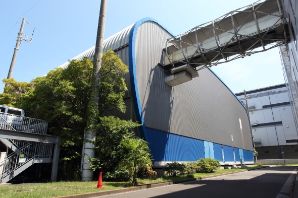 図8 研究データやシミュレーション結果を長期保存するために増設されたテープライブラリ。シミュレーションのメッシュが高解像度になり、また、アンサンブル予報のように何パターンも実行することも多いため、データサイズは膨大になるという[クリックで拡大] 撮影:関行宏地球シミュレータに合わせて建設された建屋が冒頭で触れたシミュレータ棟である(図9)。完成は2000年12月だ。
