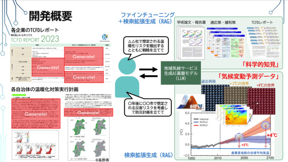 図11 JAMSTECでは、気象学などの論文、過去の気象概況や気象データ、温暖化予測データ、防災行動計画などを学習データとした独自の大規模言語モデルの開発を進めている。自治体における防災行動計画の立案や、企業活動におけるTCFD(気候関連財務情報開示タスクフォース)レポートの開示などに役立ててもらうことを想定している[クリックで拡大] 出所:海洋研究開発機構ES4ではVE搭載ノードとGPU搭載ノードが一つのシステム上に構築されているため、大量のデータを横移動することなく、シミュレーション、学習、推論を効率的に実行できる。また、これまで蓄積してきた膨大なデータを学習に使うことも可能だ。