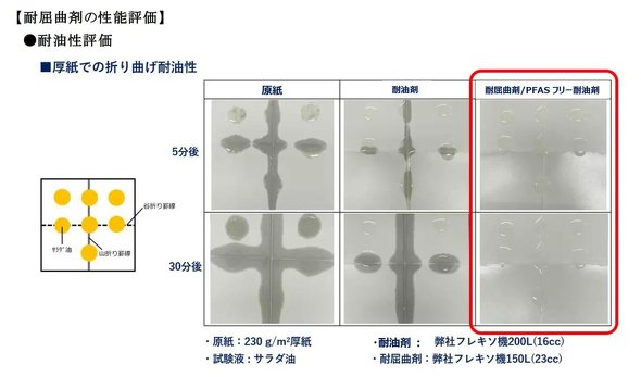 新たに開発した耐屈曲剤は、包装紙の折り曲げ加工時に生じる、耐油剤の割れを低減できる。海外法規制対応品と国内法規制対応品の2種を用意し、プラスチック包材から包装紙への転換を促進する。