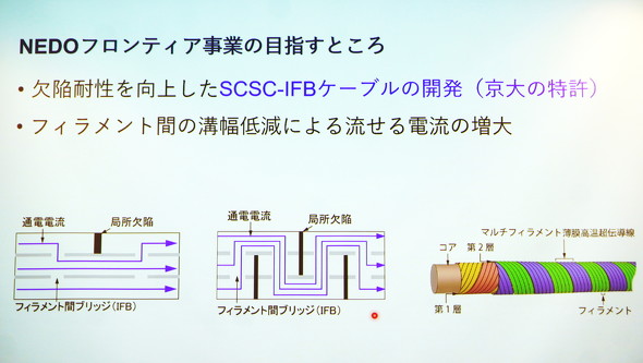 NEDOに採択された今回の事業では、京都大学をはじめとする4者が、欠陥耐性を向上するとともに、フィラメント間の溝幅低減により流せる電流を増大したSCSC-IFBケーブルの開発を目指す。電流/磁界による力への耐性アップや社会実装に向けた量産化技術の開発も目標に掲げている。雨宮氏は「開発を進めるSCSC-IFBケーブルの構造は4層に限らない。例えば、流せる電流を増やすために層数を増やすことは当然あり得る」と補足した。