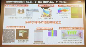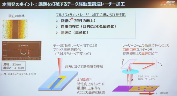 産総研では、IFB-REBCOテープの高精度マルチフィラメント化で必要な「微細加工」「目的に応じた最適化」「量産化」に対応するための「データ駆動型高速レーザー加工」の開発を進めている。